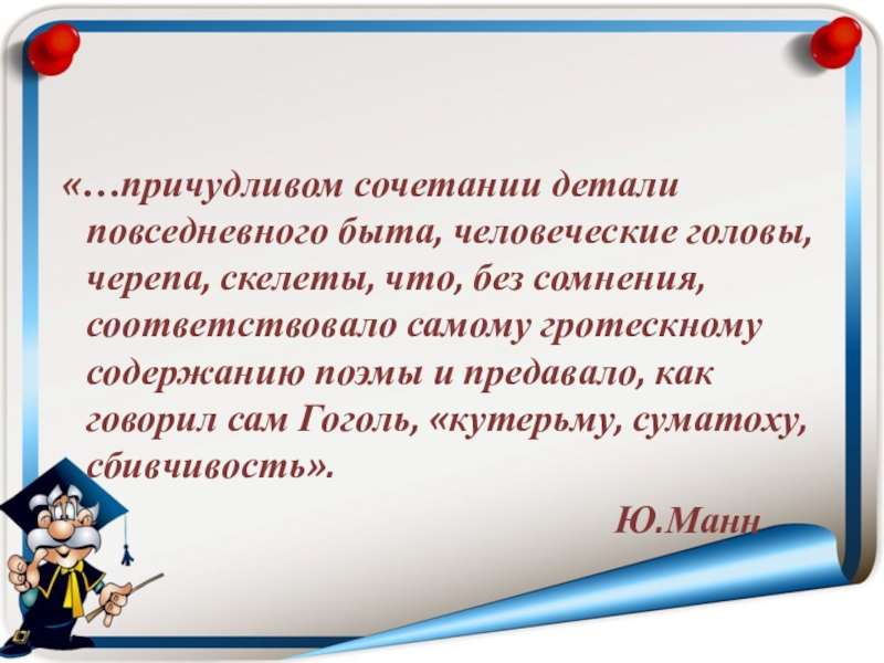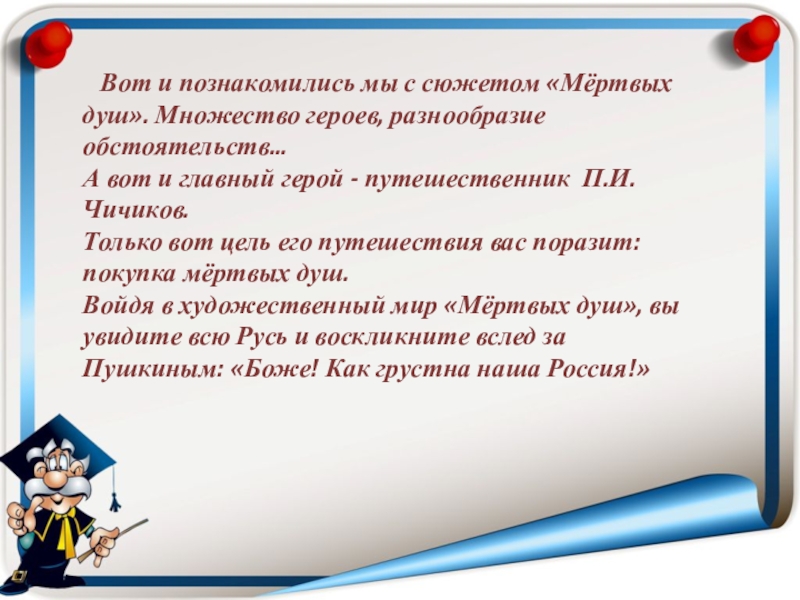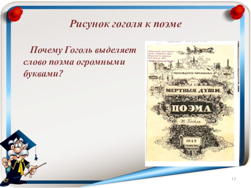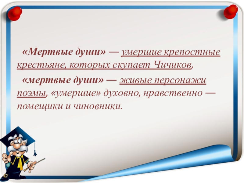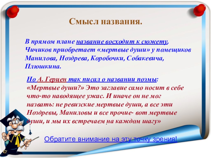 Но А. Герцен так писал о названии поэмы: «Мертвые души?» Это заглавие само носит в себе что-то наводящее ужас. И иначе он не мог назвать: не ревизские мертвые души, а все эти Ноздревы, Маниловы и все прочие- вот мертвые души, и мы их встречаем на каждом шагу»