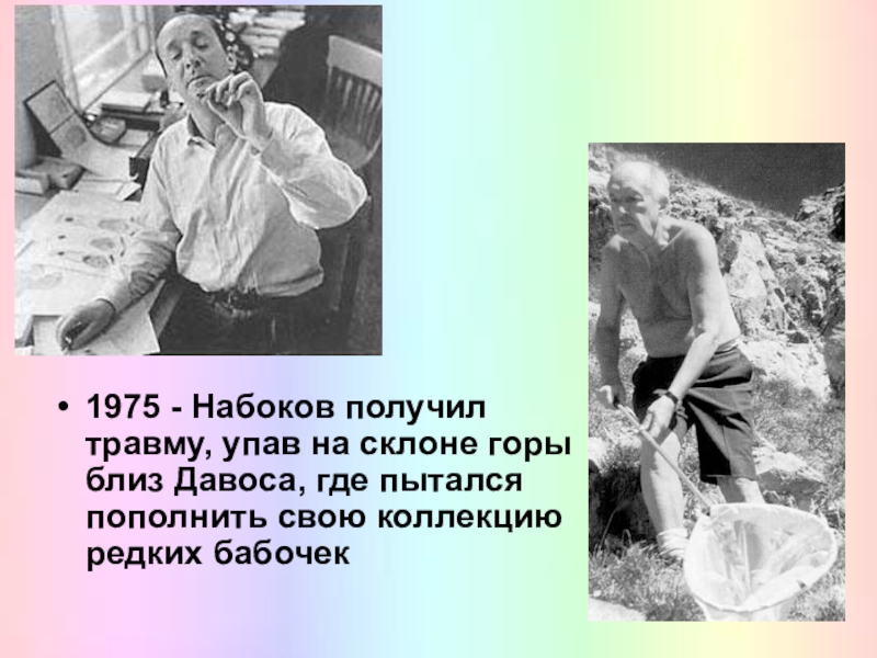 Слайд 361975 - Набоков получил травму, упав на склоне горы близ Давоса,