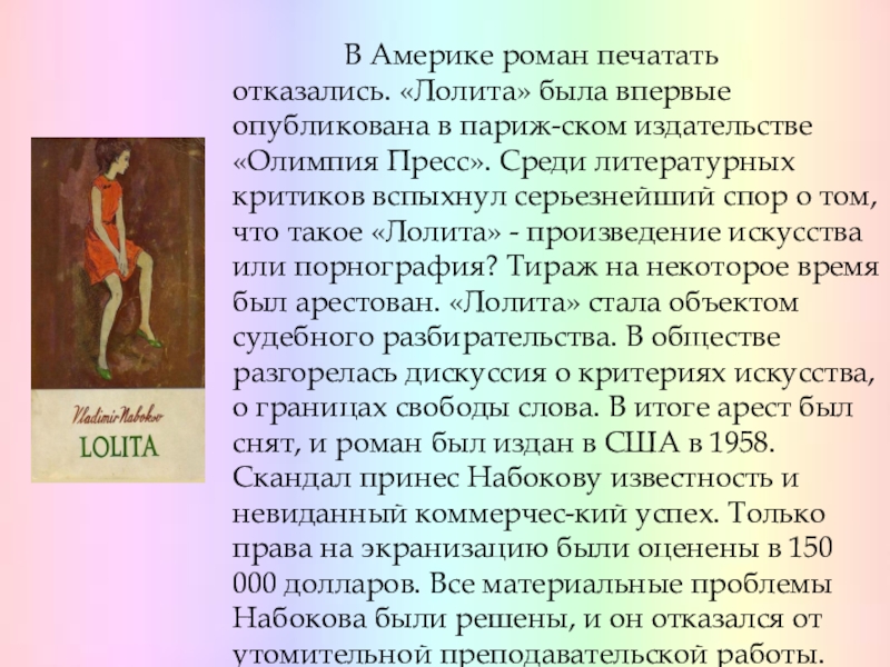 печатать отказались. «Лолита» была впервые опубликована в париж-ском издательстве «Олимпия Пресс». Среди литературных критиков вспыхнул серьезнейший спор о том, что такое «Лолита» - произведение искусства или порнография? Тираж на некоторое время был арестован. «Лолита» стала объектом судебного разбирательства. В обществе разгорелась дискуссия о критериях искусства, о границах свободы слова. В итоге арест был снят, и роман был издан в США в 1958. Скандал принес Набокову известность и невиданный коммерчес-кий успех. Только права на экранизацию были оценены в 150 000 долларов. Все материальные проблемы Набокова были решены, и он отказался от утомительной преподавательской работы.