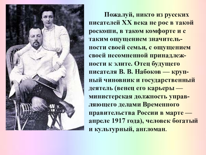 века не рос в такой роскоши, в таком комфорте и с таким ощущением значитель-ности своей семьи, с ощущением своей несомненной принадлеж-ности к элите. Отец будущего писателя В. В. Набоков — круп-ный чиновник и государственный деятель (венец его карьеры — министерская должность управ-ляющего делами Временного правительства России в марте — апреле 1917 года), человек богатый и культурный, англоман.