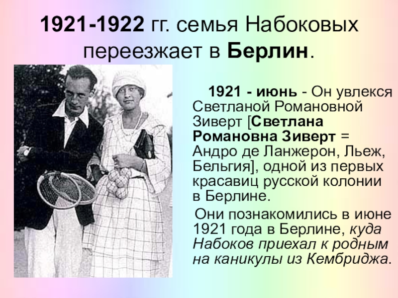 1921 - июнь - Он увлекся Светланой Романовной Зиверт [Светлана Романовна Зиверт = Андро де Ланжерон, Льеж, Бельгия], одной из первых красавиц русской колонии в Берлине.