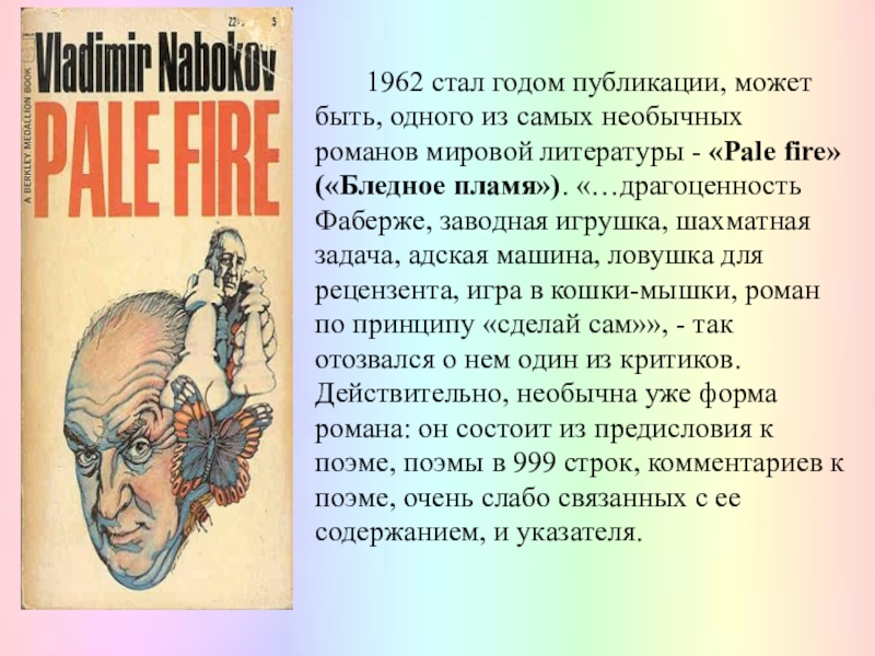 из самых необычных романов мировой литературы - «Pale fire» («Бледное пламя»). «…драгоценность Фаберже, заводная игрушка, шахматная задача, адская машина, ловушка для рецензента, игра в кошки-мышки, роман по принципу «сделай сам»», - так отозвался о нем один из критиков. Действительно, необычна уже форма романа: он состоит из предисловия к поэме, поэмы в 999 строк, комментариев к поэме, очень слабо связанных с ее содержанием, и указателя.