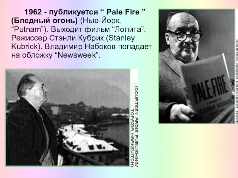 ” (Бледный огонь) (Нью-Йорк, “Putnam”). Выходит фильм “Лолита”. Режиссер Стэнли Кубрик (Stanley Kubrick). Владимир Набоков попадает на обложку “Newsweek”.