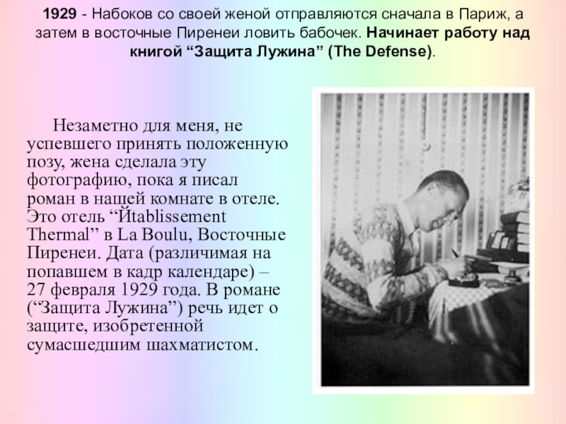 Незаметно для меня, не успевшего принять положенную позу, жена сделала эту фотографию, пока я писал роман в нашей комнате в отеле. Это отель “Йtablissement Thermal” в La Boulu, Восточные Пиренеи. Дата (различимая на попавшем в кадр календаре) – 27 февраля 1929 года. В романе (“Защита Лужина”) речь идет о защите, изобретенной сумасшедшим шахматистом.
