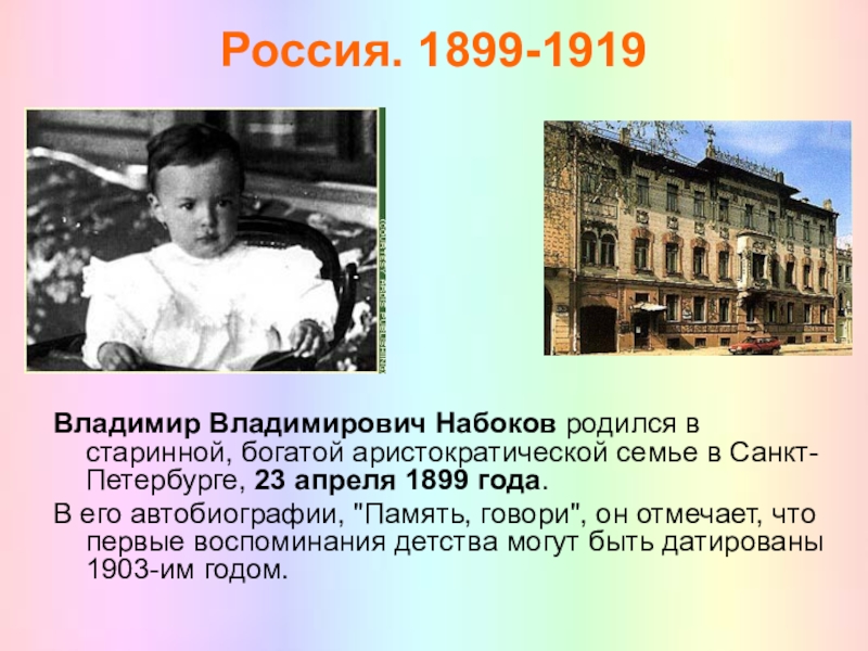 В его автобиографии, "Память, говори", он отмечает, что первые воспоминания детства могут быть датированы 1903-им годом.