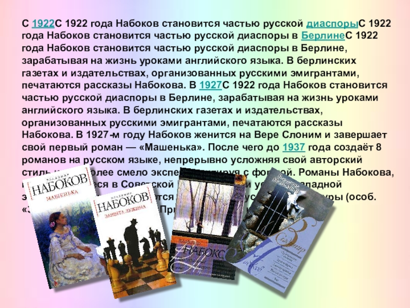 Набоков становится частью русской диаспоры в БерлинеС 1922 года Набоков становится частью русской диаспоры в Берлине, зарабатывая на жизнь уроками английского языка. В берлинских газетах и издательствах, организованных русскими эмигрантами, печатаются рассказы Набокова. В 1927С 1922 года Набоков становится частью русской диаспоры в Берлине, зарабатывая на жизнь уроками английского языка. В берлинских газетах и издательствах, организованных русскими эмигрантами, печатаются рассказы Набокова. В 1927-м году Набоков женится на Вере Слоним и завершает свой первый роман — «Машенька». После чего до 1937 года создаёт 8 романов на русском языке, непрерывно усложняя свой авторский стиль и всё более смело экспериментируя с формой. Романы Набокова, не печатавшиеся в Советской России, имели успех у западной эмиграции, и ныне считаются шедеврами русской литературы (особ. «Защита Лужина», «Дар», «Приглашение на казнь»).