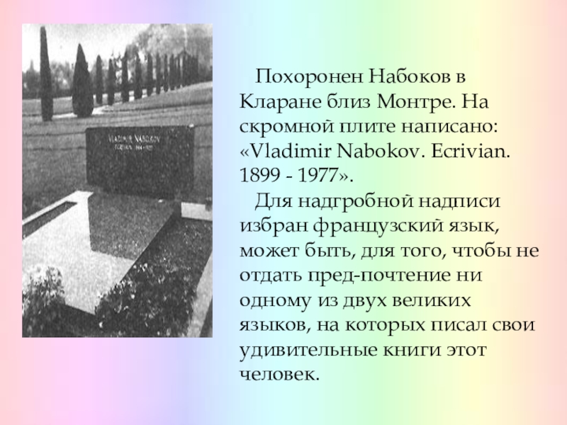 Слайд 39 Похоронен Набоков в Кларане близ Монтре. На скромной плите