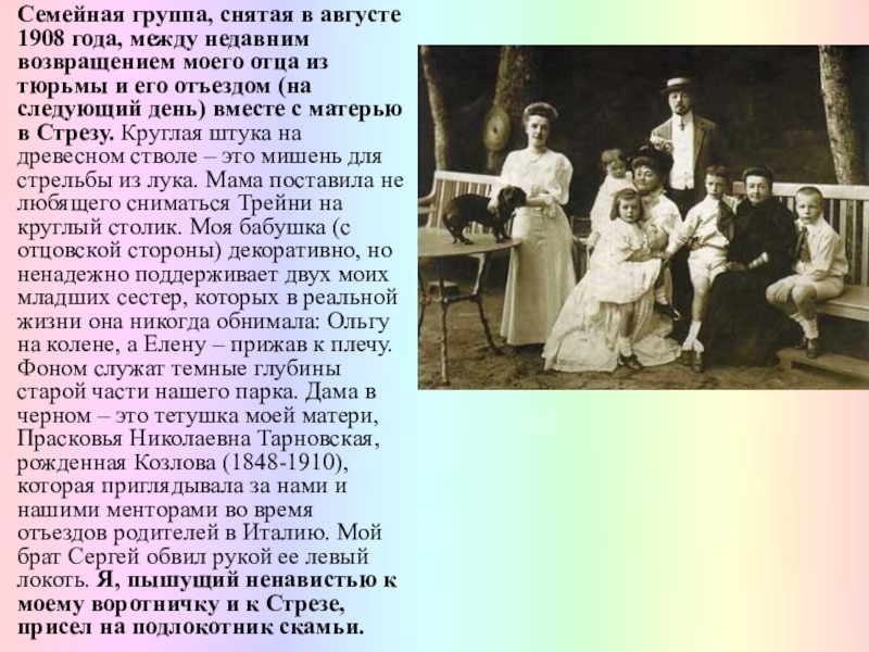 Слайд 10Семейная группа, снятая в августе 1908 года, между недавним возвращением моего