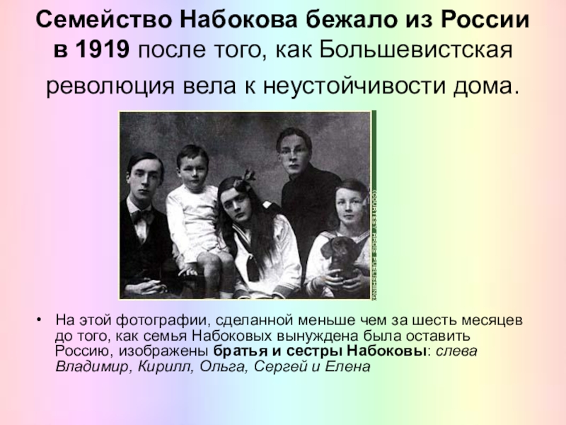 Слайд 15Семейство Набокова бежало из России в 1919 после того, как Большевистская