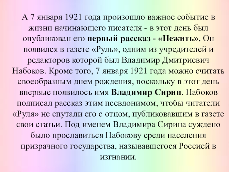 писателя - в этот день был опубликован его первый рассказ - «Нежить». Он появился в газете «Руль», одним из учредителей и редакторов которой был Владимир Дмитриевич Набоков. Кроме того, 7 января 1921 года можно считать своеобразным днем рождения, поскольку в этот день впервые появилось имя Владимир Сирин. Набоков подписал рассказ этим псевдонимом, чтобы читатели «Руля» не спутали его с отцом, публиковавшим в газете свои статьи. Под именем Владимира Сирина суждено было прославиться Набокову среди населения призрачного государства, называвшегося Россией в изгнании.