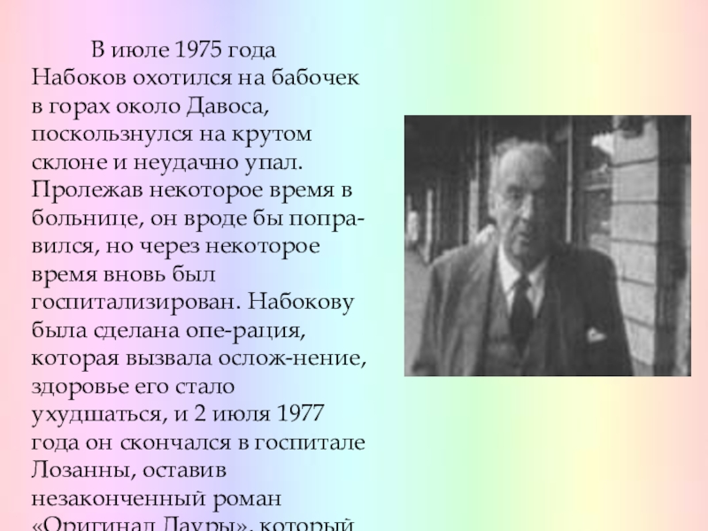на бабочек в горах около Давоса, поскользнулся на крутом склоне и неудачно упал. Пролежав некоторое время в больнице, он вроде бы попра-вился, но через некоторое время вновь был госпитализирован. Набокову была сделана опе-рация, которая вызвала ослож-нение, здоровье его стало ухудшаться, и 2 июля 1977 года он скончался в госпитале Лозанны, оставив незаконченный роман «Оригинал Лауры», который завещал уничтожить.