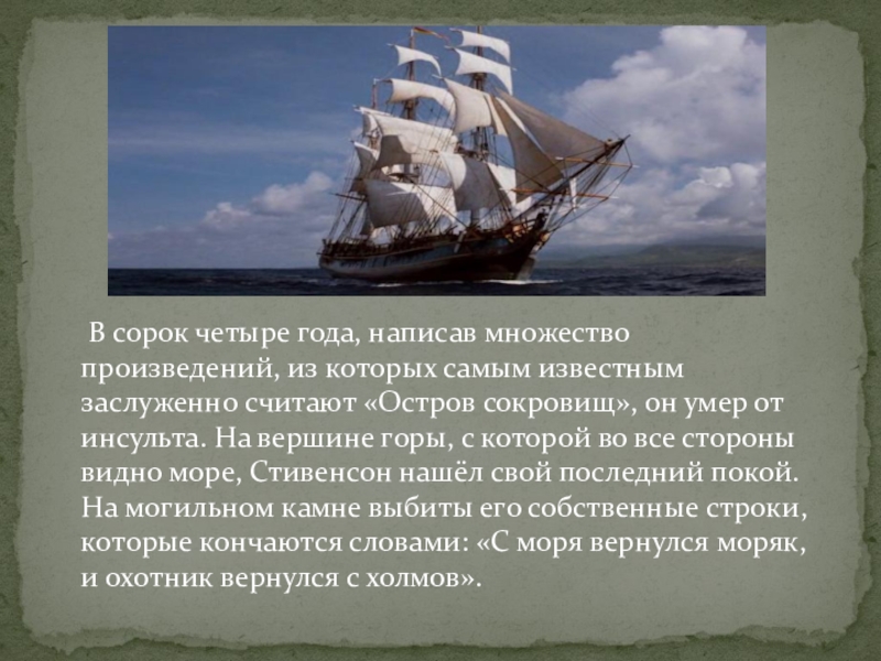 известным заслуженно считают «Остров сокровищ», он умер от инсульта. На вершине горы, с которой во все стороны видно море, Стивенсон нашёл свой последний покой. На могильном камне выбиты его собственные строки, которые кончаются словами: «С моря вернулся моряк, и охотник вернулся с холмов».