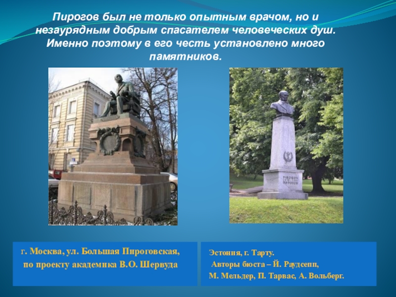 Пирогов был не только опытным врачом, но и незаурядным добрым спасателем человеческих душ. Именно поэтому в его честь установлено много памятников.