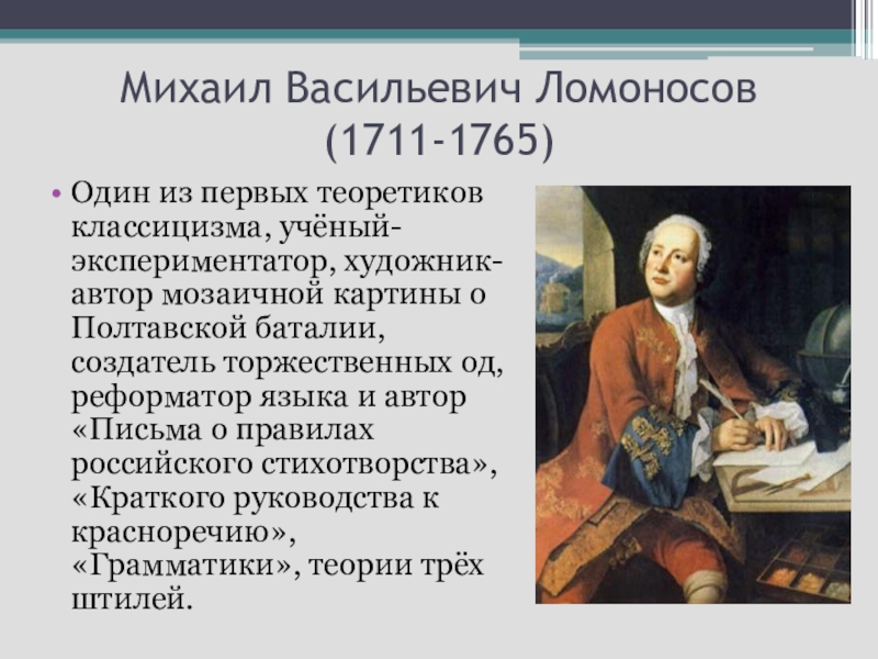 картины о Полтавской баталии, создатель торжественных од, реформатор языка и автор «Письма о правилах российского стихотворства», «Краткого руководства к красноречию», «Грамматики», теории трёх штилей.