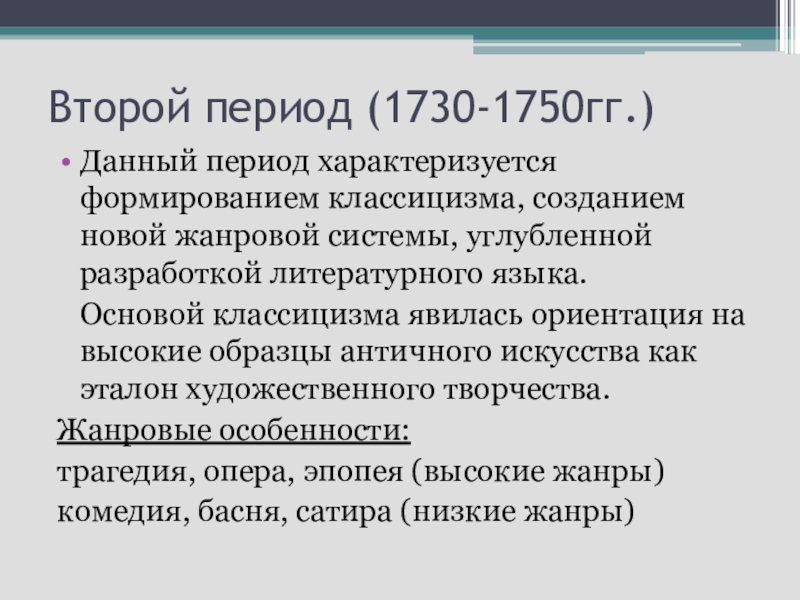 Данный период характеризуется формированием классицизма, созданием новой жанровой системы,