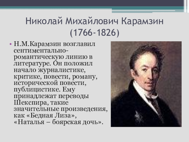 начало журналистике, критике, повести, роману, исторической повести, публицистике. Ему принадлежат переводы Шекспира, такие значительные произведения, как «Бедная Лиза», «Наталья – боярская дочь».