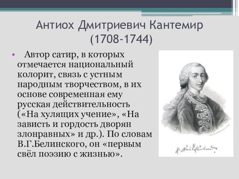 колорит, связь с устным народным творчеством, в их основе современная ему русская действительность («На хулящих учение», «На зависть и гордость дворян злонравных» и др.). По словам В.Г.Белинского, он «первым свёл поэзию с жизнью».