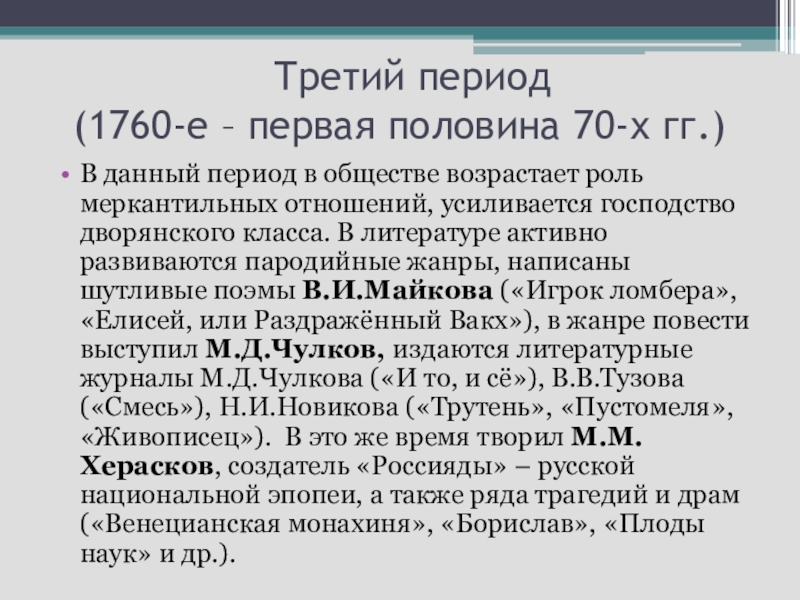 в обществе возрастает роль меркантильных отношений, усиливается господство дворянского класса. В литературе активно развиваются пародийные жанры, написаны шутливые поэмы В.И.Майкова («Игрок ломбера», «Елисей, или Раздражённый Вакх»), в жанре повести выступил М.Д.Чулков, издаются литературные журналы М.Д.Чулкова («И то, и сё»), В.В.Тузова («Смесь»), Н.И.Новикова («Трутень», «Пустомеля», «Живописец»). В это же время творил М.М.Херасков, создатель «Россияды» – русской национальной эпопеи, а также ряда трагедий и драм («Венецианская монахиня», «Борислав», «Плоды наук» и др.).
