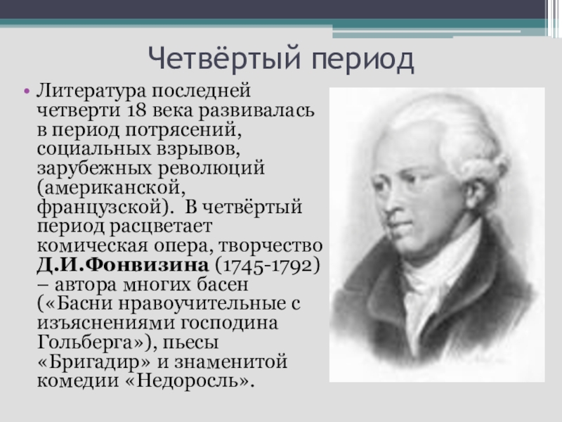 взрывов, зарубежных революций (американской, французской). В четвёртый период расцветает комическая опера, творчество Д.И.Фонвизина (1745-1792) – автора многих басен («Басни нравоучительные с изъяснениями господина Гольберга»), пьесы «Бригадир» и знаменитой комедии «Недоросль».