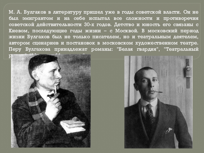 Он не был эмигрантом и на себе испытал все сложности и противоречия советской действительности 30-х годов. Детство и юность его связаны с Киевом, последующие годы жизни – с Москвой. В московский период жизни Булгаков был не только писателем, но и театральным деятелем, автором сценариев и постановок в московском художественном театре. Перу Булгакова принадлежат романы: "Белая гвардия", "Театральный роман", "Мастер и Маргарита".