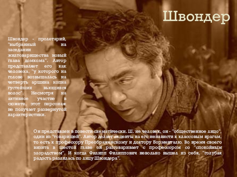 лицо", один из "товарищей". Автор делает акценты на его ненависти к классовым врагам, то есть к профессору Преображенскому и доктору Борменталю. Во время своего визита в шестой главе он разговаривает с профессором со "спокойным злорадством". И когда Филипп Филиппович невольно вышел из себя, "голубая радость разлилась по лицу Швондера".