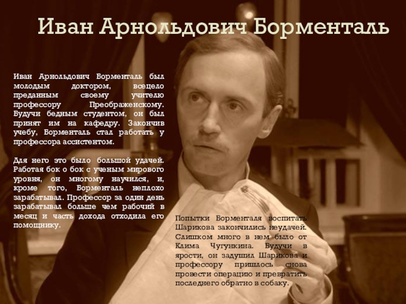 учителю профессору Преображенскому. Будучи бедным студентом, он был принят им на кафедру. Закончив учебу, Борменталь стал работать у профессора ассистентом.