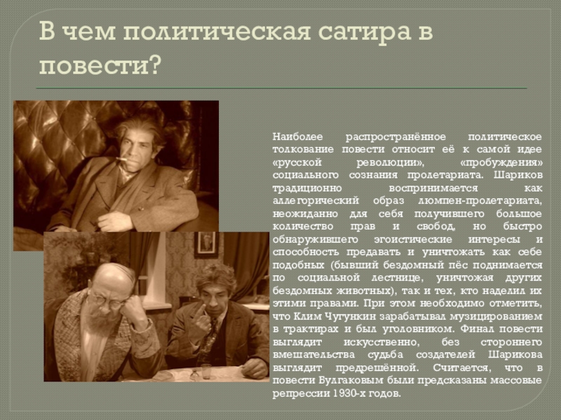 её к самой идее «русской революции», «пробуждения» социального сознания пролетариата. Шариков традиционно воспринимается как аллегорический образ люмпен-пролетариата, неожиданно для себя получившего большое количество прав и свобод, но быстро обнаружившего эгоистические интересы и способность предавать и уничтожать как себе подобных (бывший бездомный пёс поднимается по социальной лестнице, уничтожая других бездомных животных), так и тех, кто наделил их этими правами. При этом необходимо отметить, что Клим Чугункин зарабатывал музицированием в трактирах и был уголовником. Финал повести выглядит искусственно, без стороннего вмешательства судьба создателей Шарикова выглядит предрешённой. Считается, что в повести Булгаковым были предсказаны массовые репрессии 1930-х годов.