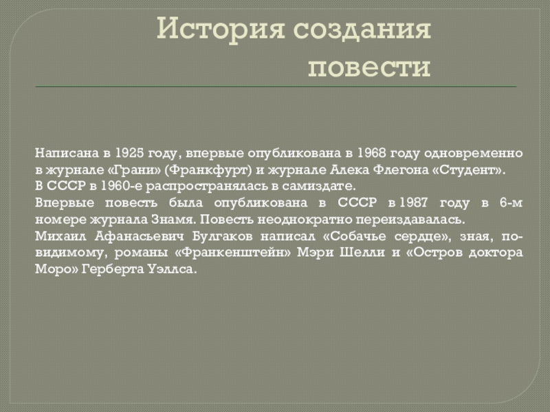 Михаил Афанасьевич Булгаков написал «Собачье сердце», зная, по-видимому, романы «Франкенштейн» Мэри Шелли и «Остров доктора Моро» Герберта Уэллса.