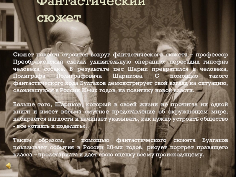 Сюжет повести строится вокруг фантастического сюжета – профессор Преображенский сделал