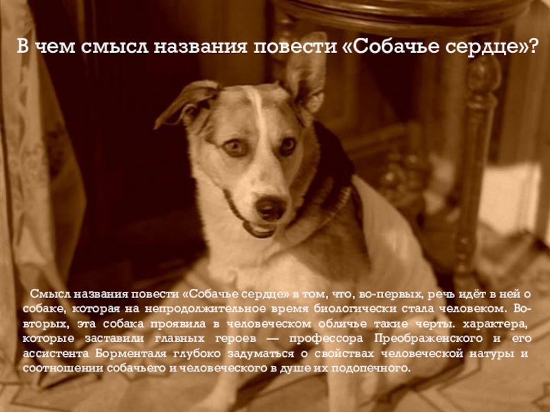 Слайд 6В чем смысл названия повести «Собачье сердце»?