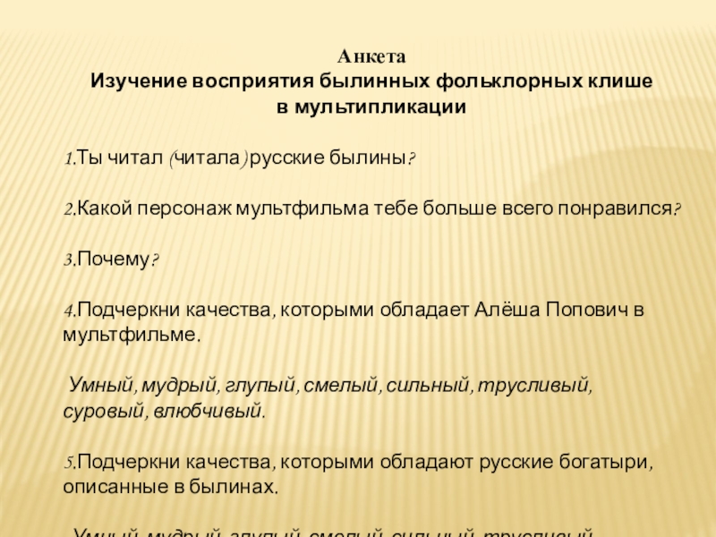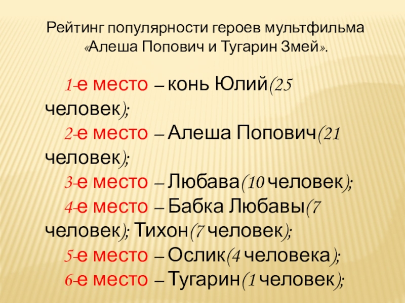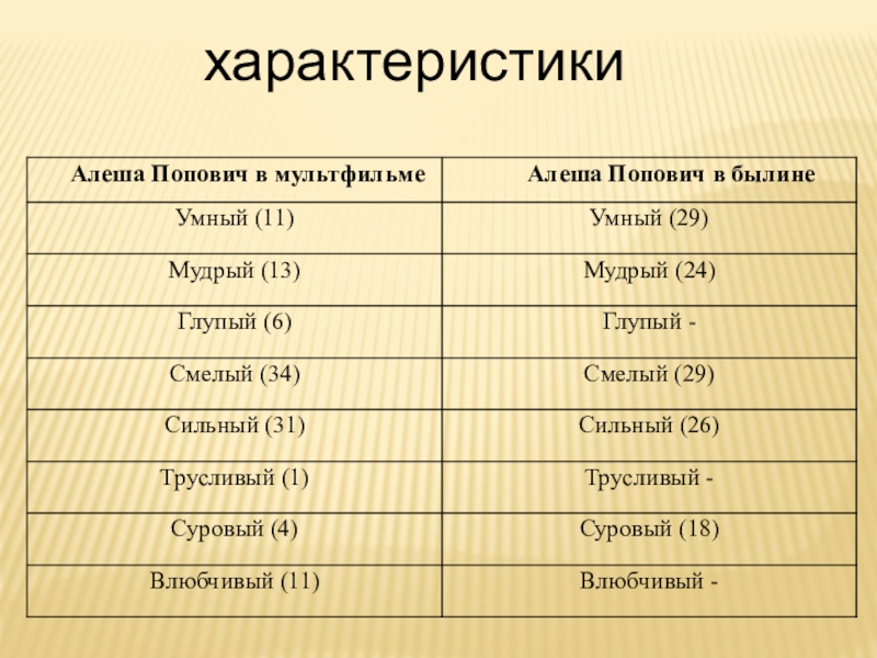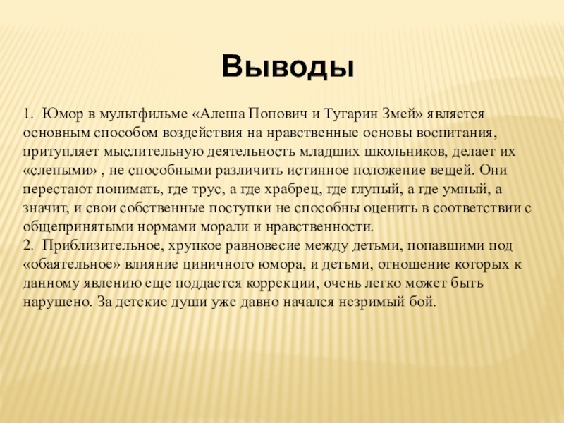 1. Юмор в мультфильме «Алеша Попович и Тугарин Змей» является основным способом воздействия на нравственные основы воспитания, притупляет мыслительную деятельность младших школьников, делает их «слепыми» , не способными различить истинное положение вещей. Они перестают понимать, где трус, а где храбрец, где глупый, а где умный, а значит, и свои собственные поступки не способны оценить в соответствии с общепринятыми нормами морали и нравственности.