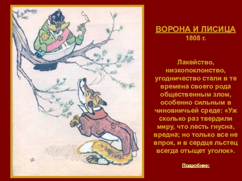 рода общественным злом, особенно сильным в чиновничьей среде: «Уж сколько раз твердили миру, что лесть гнусна, вредна; но только все не впрок, и в сердце льстец всегда отыщет уголок».