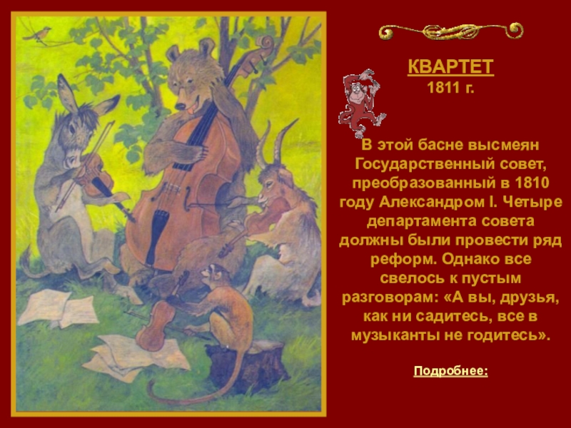 В этой басне высмеян Государственный совет, преобразованный в 1810 году