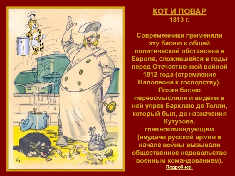 в Европе, сложившейся в годы перед Отечественной войной 1812 года (стремление Наполеона к господству). Позже басню переосмыслили и видели в ней упрек Барклаю де Толли, который был, до назначения Кутузова, главнокомандующим (неудачи русской армии в начале войны вызывали общественное недовольство военным командованием).