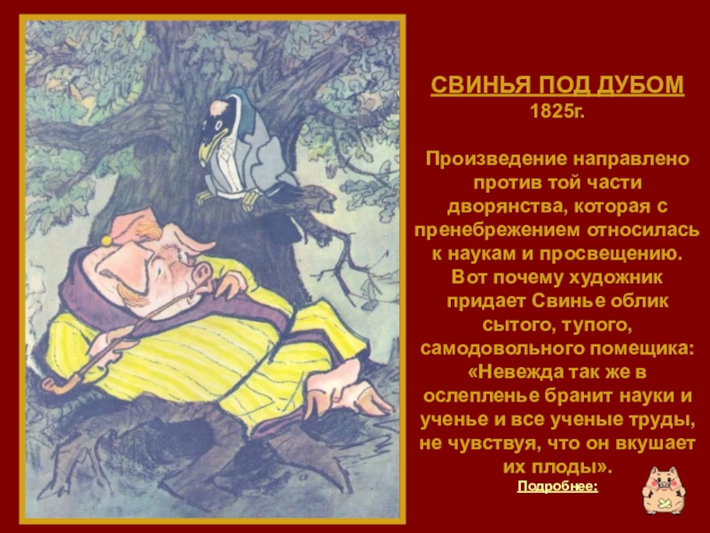 относилась к наукам и просвещению. Вот почему художник придает Свинье облик сытого, тупого, самодовольного помещика: «Невежда так же в ослепленье бранит науки и ученье и все ученые труды, не чувствуя, что он вкушает их плоды».