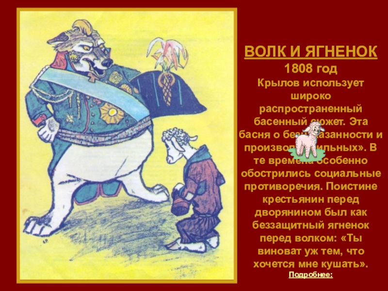 о безнаказанности и произволе «сильных». В те времена особенно обострились социальные противоречия. Поистине крестьянин перед дворянином был как беззащитный ягненок перед волком: «Ты виноват уж тем, что хочется мне кушать».