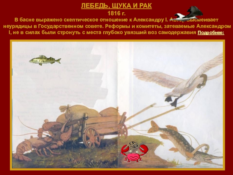 l. Автор высмеивает неурядицы в Государственном совете. Реформы и комитеты, затеваемые Александром l, не в силах были стронуть с места глубоко увязший воз самодержавия Подробнее: