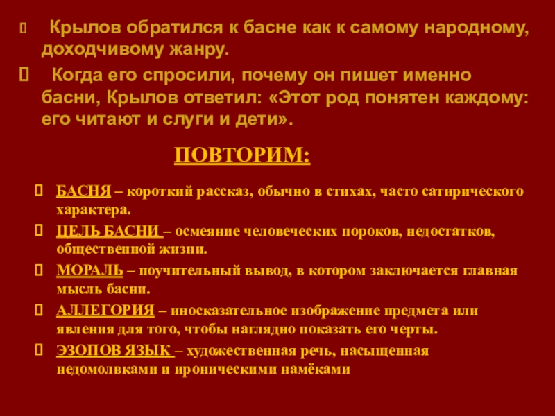 Слайд 4 Крылов обратился к басне как к самому народному, доходчивому жанру.