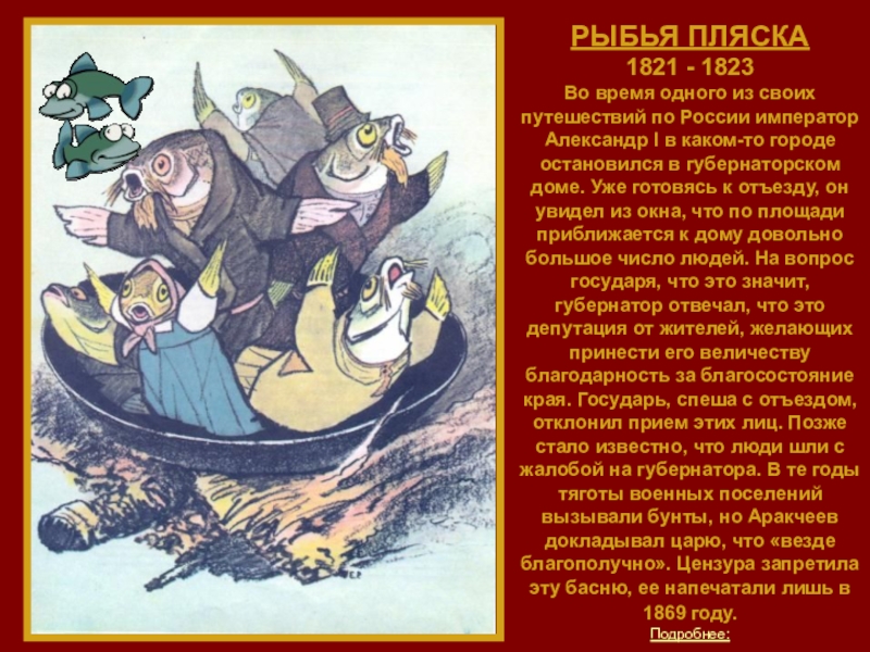 император Александр l в каком-то городе остановился в губернаторском доме. Уже готовясь к отъезду, он увидел из окна, что по площади приближается к дому довольно большое число людей. На вопрос государя, что это значит, губернатор отвечал, что это депутация от жителей, желающих принести его величеству благодарность за благосостояние края. Государь, спеша с отъездом, отклонил прием этих лиц. Позже стало известно, что люди шли с жалобой на губернатора. В те годы тяготы военных поселений вызывали бунты, но Аракчеев докладывал царю, что «везде благополучно». Цензура запретила эту басню, ее напечатали лишь в 1869 году.
