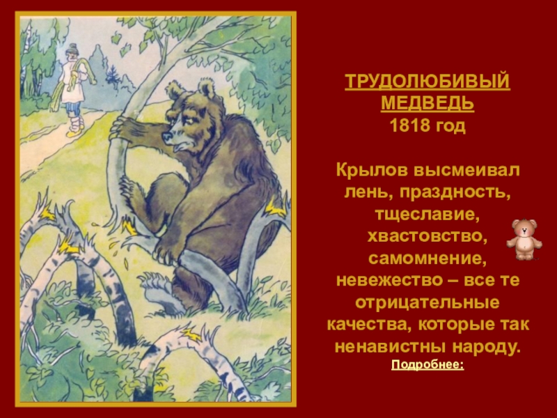 Крылов высмеивал лень, праздность, тщеславие, хвастовство, самомнение, невежество –