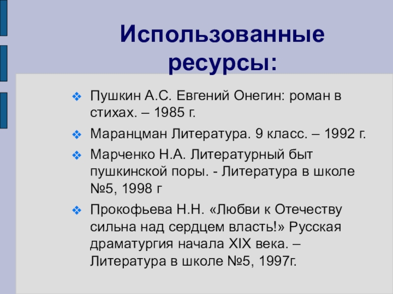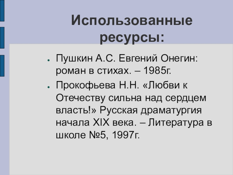 Прокофьева Н.Н. «Любви к Отечеству сильна над сердцем власть!» Русская драматургия начала XIX века. – Литература в школе №5, 1997г.