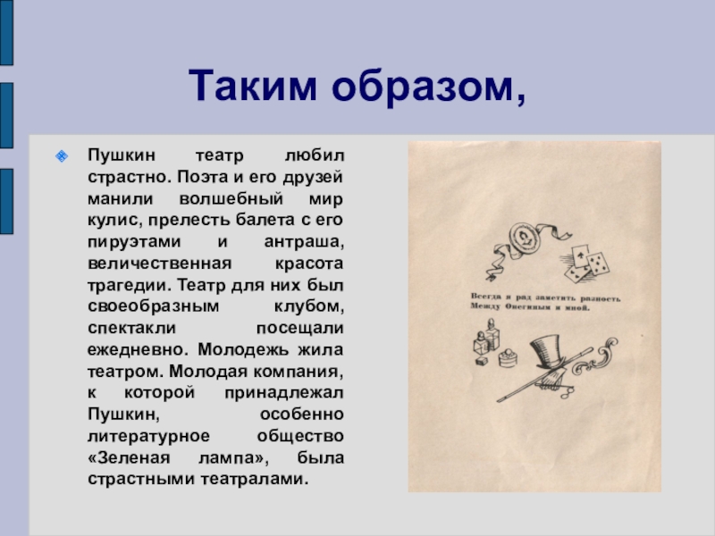 мир кулис, прелесть балета с его пируэтами и антраша, величественная красота трагедии. Театр для них был своеобразным клубом, спектакли посещали ежедневно. Молодежь жила театром. Молодая компания, к которой принадлежал Пушкин, особенно литературное общество «Зеленая лампа», была страстными театралами.