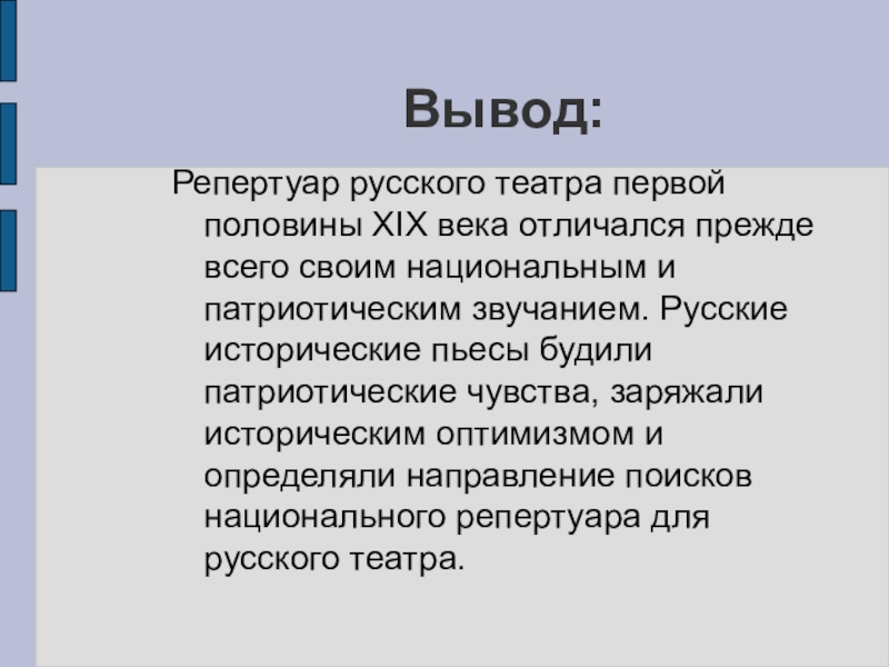 национальным и патриотическим звучанием. Русские исторические пьесы будили патриотические чувства, заряжали историческим оптимизмом и определяли направление поисков национального репертуара для русского театра.
