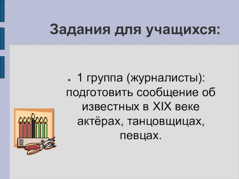 1 группа (журналисты): подготовить сообщение об известных в XIX