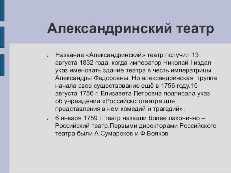 6 января 1759 г. театр назвали более лаконично – Российский театр.Первыми директорами Российского театра были А.Сумароков и Ф.Волков.