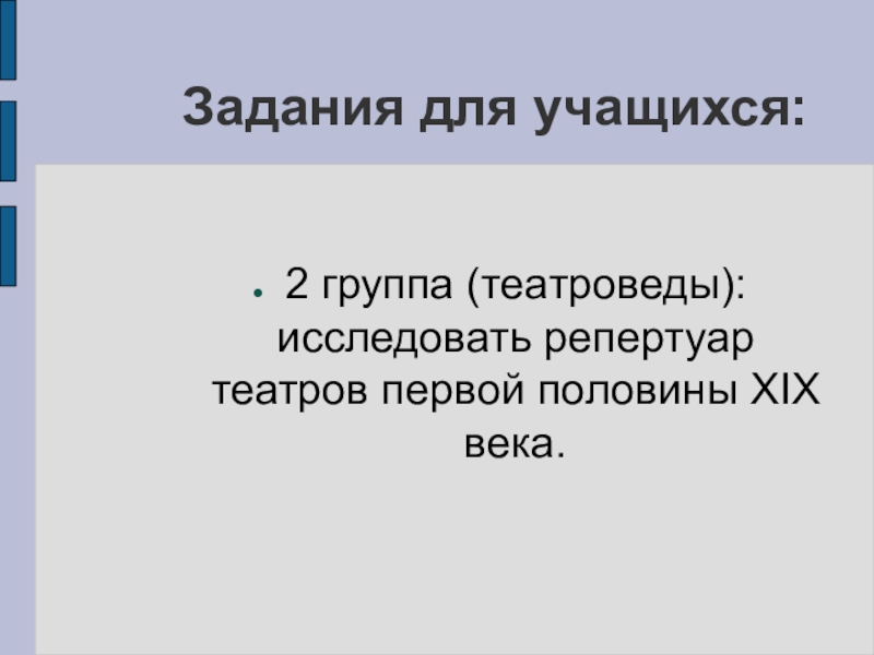 2 группа (театроведы): исследовать репертуар театров первой половины XIX