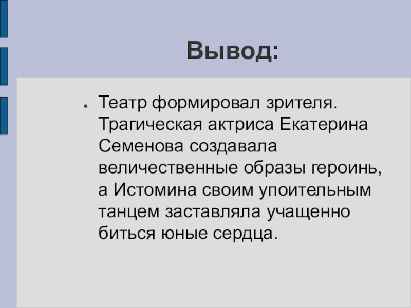 Театр формировал зрителя. Актеры и актрисы создавали величественные образы героинь, а танцоры театра своими упоительными танцами заставляли учащенно биться юные сердца.