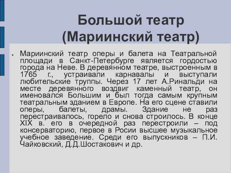 в Санкт-Петербурге является гордостью города на Неве. В деревянном театре, выстроенным в 1765 г., устраивали карнавалы и выступали любительские труппы. Через 17 лет А.Ринальди на месте деревянного воздвиг каменный театр, он именовался Большим и был тогда самым крупным театральным зданием в Европе. На его сцене ставили оперы, балеты, драмы. Здание не раз перестраивалось, горело и снова строилось. В конце XIX в. его в очередной раз перестроили – под консерваторию, первое в Росии высшее музыкальное учебное заведение. Среди его выпускников – П.И.Чайковский, Д.Д.Шостакович и др.