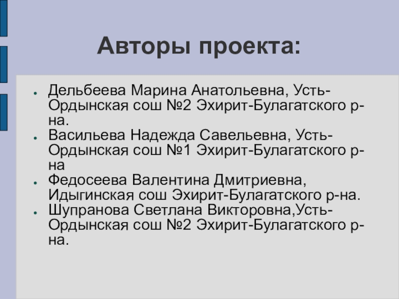 Федосеева Валентина Дмитриевна, Идыгинская сош Эхирит-Булагатского р-на.