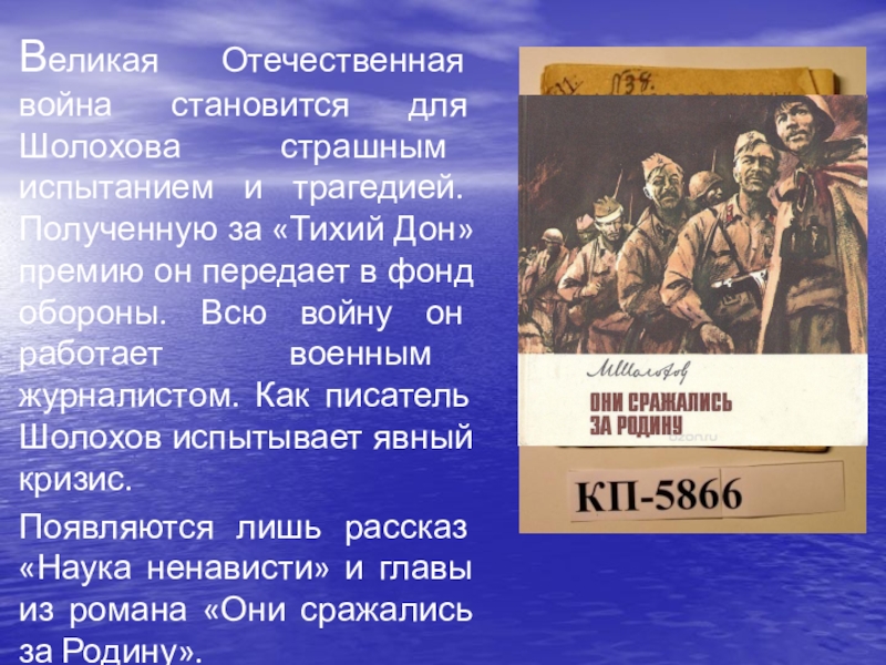за «Тихий Дон» премию он передает в фонд обороны. Всю войну он работает военным журналистом. Как писатель Шолохов испытывает явный кризис.